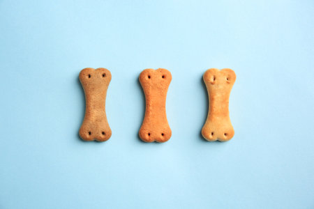 Bone shaped dog cookies on light blue background, flat lay