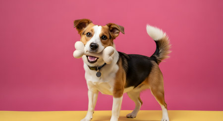 An adorable and happy tri-color dog stands proudly against a vibrant pink and yellow studio background, holding a large white toy bone in its mouth. The playful pup looks directly at the camera with a cheerful expression, its tail wagging. This charming image is perfect for pet-related advertising, veterinary services, or dog food brands.