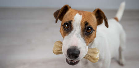 The dog holds a bone in its mouth. Jack russell terrier eating rawhide treat.