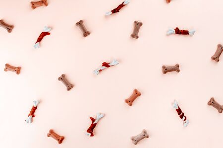 Dog food pattern made with dry snacks in shape of bones. Funny cute flat lay texture on light peachy background. Home pets, animals feeding. Special diet, training supply.