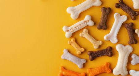 Yellow one-color background with colored dog bone snacks in a row, close up, top view. Pet care and veterinary concept. Spase for your text or image.
