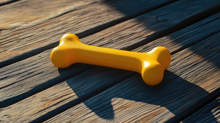 A bright yellow dog toy bone rests on textured wooden planks, casting playful shadows. Ideal for pet lovers seeking vibrant and cheerful imagery of canine joy.