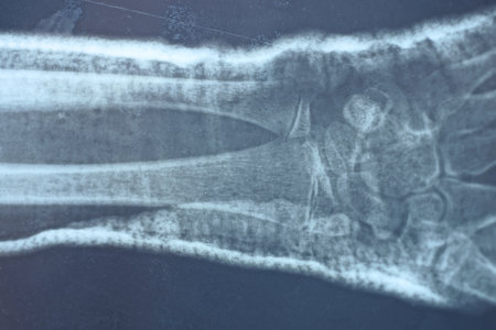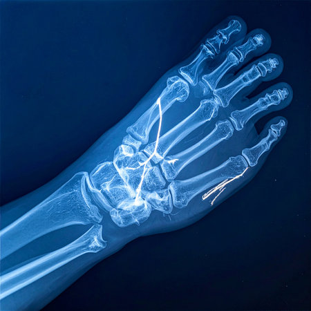 Detailing the closed fracture of a hand's skeletal structure with clear visibility of bones