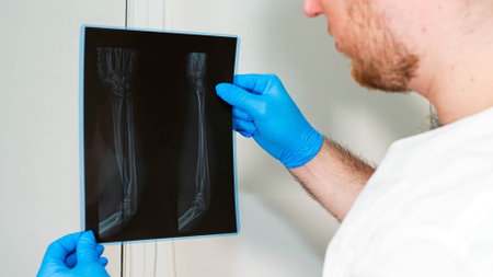 Right forearm x-ray, Male doctor examines arm injury, medical professional looks at x-ray of muscle injury