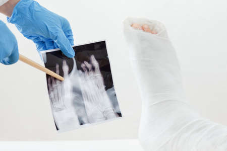 Doctor examines x-ray image, broken leg of the patient in plaster lying on the couch, on white background