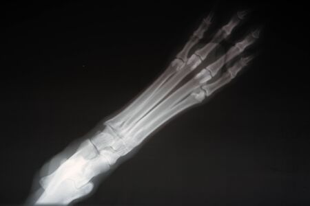 Radiography of a dog paw. Real x ray image of an injured dog paw.