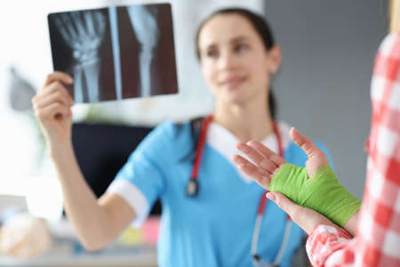 Woman wearing arm sling and looking at X-ray image. Female suffering from shoulder, clavicle, acromion fracture, strain. Health care, injury diagnostics concept. High quality photo