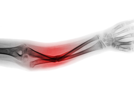 X-ray image of forearm, lateral view, Showing ulnar and radius fractues.