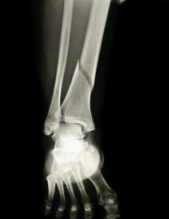 x-ray of the leg. A steel plate holding together the tibia of the leg.