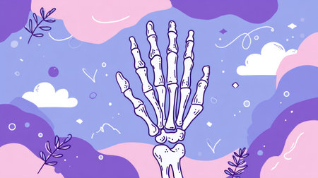 A white skeletal hand, fingers outstretched, is centered against a colorful abstract background of pastel purple and pink shapes with small clouds.
