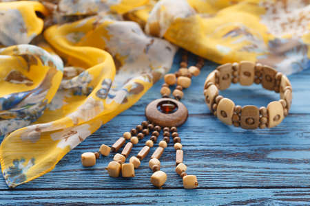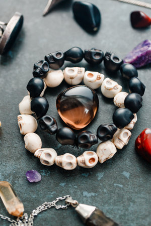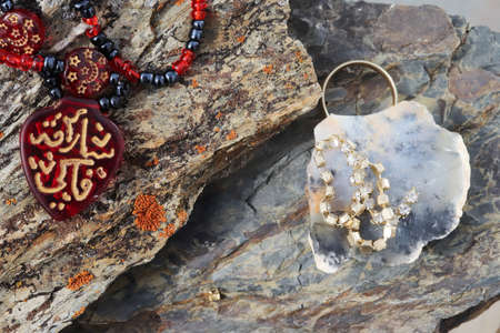 Jewelry and bracelets made of natural stones, natural minerals, top view and place for text