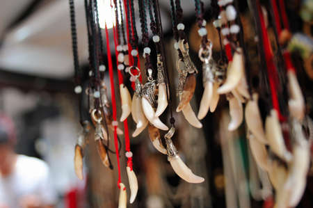 Animal's fang amulet for sale. Souvenirs made of animal's bone and tooth for sale as amulet at the Thai-Cambodia border market.