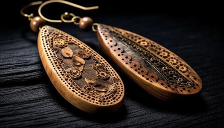 Stunning handcrafted wooden earrings featuring intricate patterns, elegantly resting on a rustic wooden surface. Perfect for fashion lovers and accessory enthusiasts.