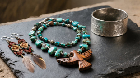 A vibrant display of handmade jewelry featuring unique pendants, feathers, and stones, artistically arranged on a rustic wooden background, showcasing creativity and craftsmanship.