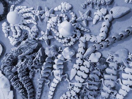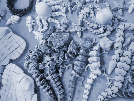Art objects printed on a 3D printer. Various creative models created on a 3D printer from molten plastic. Concept 3D Printing. New modern 3D Printing additive technology. Blue color