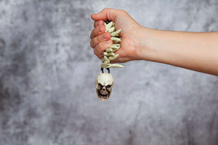 A man's right hand holding a pendant with fangs, bones and a small skull on a textured gray background.