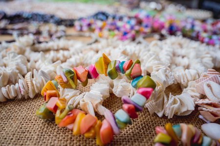 Variery of different woman accessories with shells on a Bali handmade market. Bali, Indonesia.