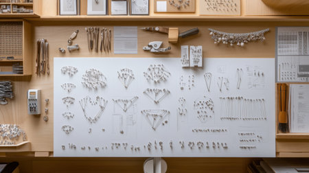 A meticulously organized craft table showcases an array of metal components and tools for jewelry making, emphasizing creativity and attention to detail in design work.