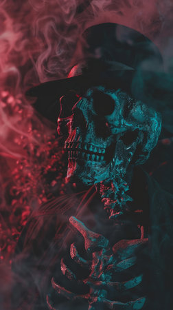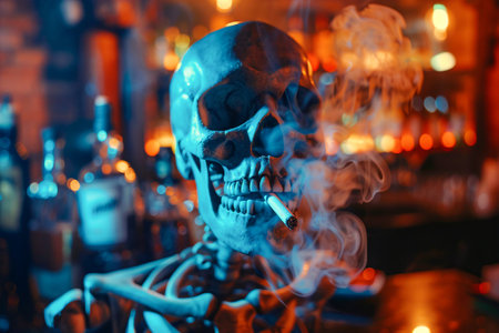 Blue-lit skeleton with a cigarette, surrounded by smoke in a moody bar atmosphere. Generative AI