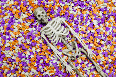 Texture in the colors of the Halloween holiday. Background of confectionery sprinkles in the form of colored stars or stars. Skeleton figure is lying on purple-orange sweets.