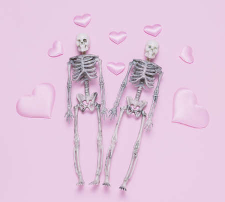 Top view skeleton couple and pink hearts pastel pink background. Minimal st. Valentines day card.