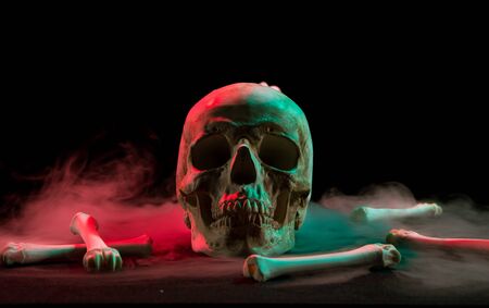 Human skull near bones and thick white smoke flowing around for Day of Dead on dark background with red and green light.
