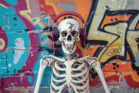 A skeleton wearing headphones is sitting on a wall with graffiti. The skull is wearing a red headband and he is listening to music. The graffiti on the wall adds a sense of urban decay