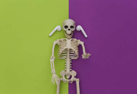 Skeleton and wireless headphones on green purple background. top view