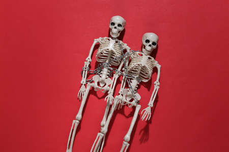 Two skeletons wrapped in chain on a red bright background