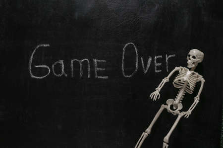 Skeleton and Word game over chalk hand drawn on blackboard