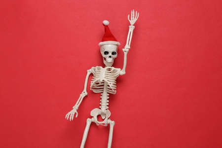 Skeleton with santa hat on red background