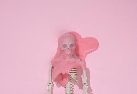 Creative Halloween layout, Skeleton with slime on pink background with shadow. visual trend. fresh ideas. concept pop