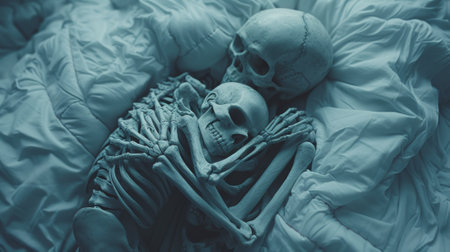 A couple of a skeleton hugging another one on top of some pillows, AI