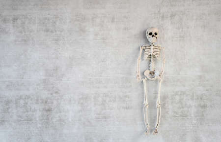 Halloween background with plastic human skeleton on white gray concreate or cement wall background and space for write text on, decorate or inviting halloween concept.