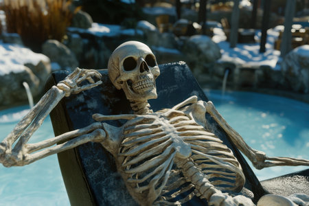 A skeleton lounges by a pool covered in snow, enjoying the winter atmosphere and sunshine, creating a humorous contrast.
