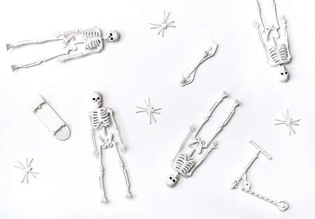 Flat lay of skeletons, skateboards, scooter and spiders. White toys on the white background. Minimalism style. Concept of Halloween or Day of the dead.