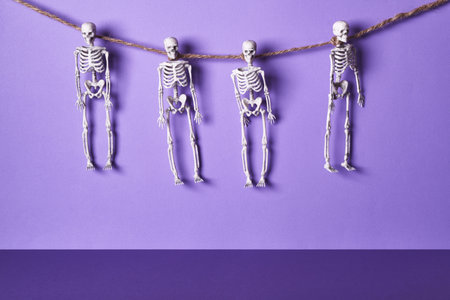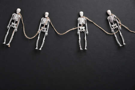 Happy halloween holiday concept. Skeleton garland on black background. Flat lay, top view, overhead.