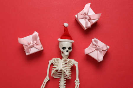 White skull in party xmas Santa Claus hat on light pink background. Christmas and New Year celebration concept.