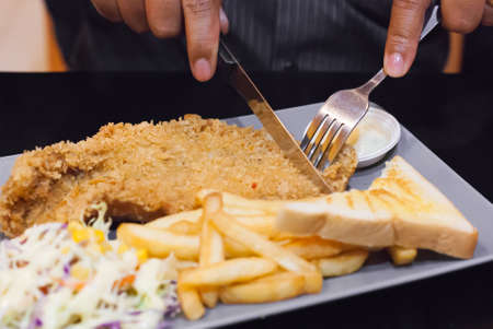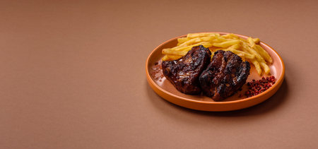 Closeup of grilled pork steak with salad on a plate, frenchfries and salad vegetables