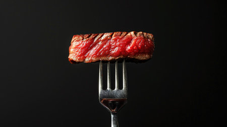 Fork with slices of beef steak medium rare, black clean background. Aesthetic restaurant concept. Generative AI.