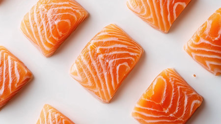 This image showcases neatly arranged fresh salmon slices on a clean white surface, emphasizing their stunning texture and vibrant color. Ideal for culinary use.