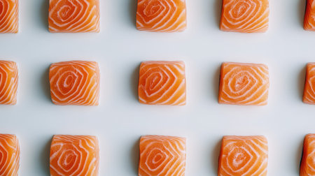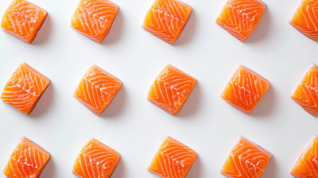 An artistic arrangement of fresh salmon slices presented on a clean white surface, showcasing vibrant colors and textures, perfect for food photography.
