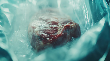 A captivating close-up of fresh raw meat sitting on ice within translucent plastic packaging, showcasing the rich textures and quality for culinary enthusiasts.