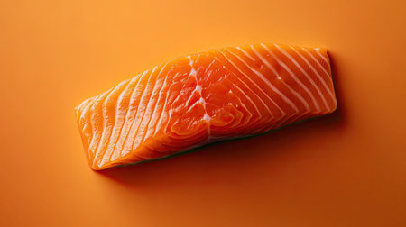 Fresh salmon fillet displayed on a vivid orange surface, showcasing its rich texture and color, ideal for culinary and health-themed visuals.