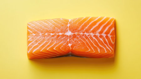 An appetizing fresh salmon fillet displayed on a bright yellow background, perfect for culinary photography and food styling projects.