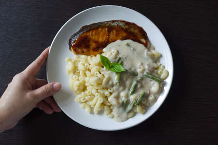 salmon steak white sauce macaroni and vegetable