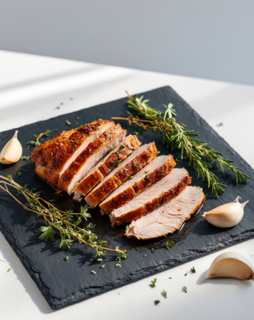 AI Generated. Crispy duck breast served with fresh herbs and garlic on slate platter
