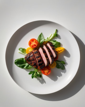 AI Generated. Plate of food with a piece of meat and vegetables
