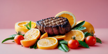 AI Generated. Juicy Steak with Vibrant Citrus and Tomatoes on Pink Background