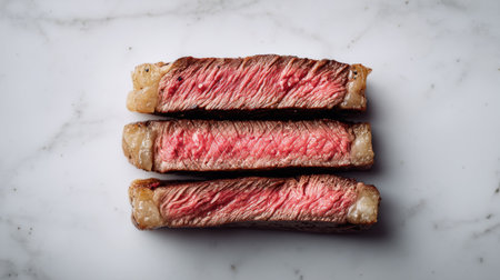 This image captures a beautifully cooked steak with a tender pink center, resting on a sleek marble background, ideal for food styling and culinary art.